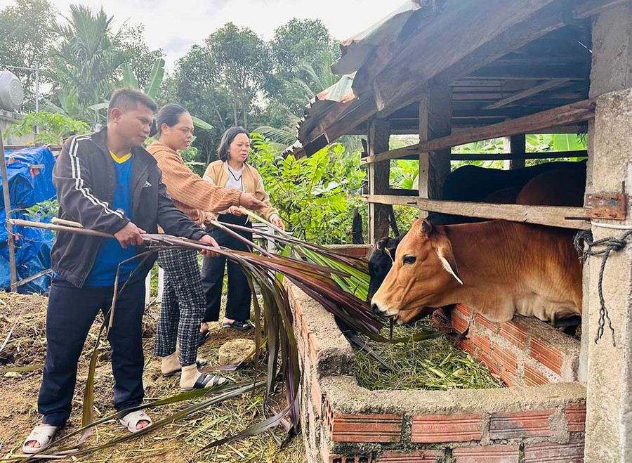 Chị Mang Thị Thanh Thẩn (giữa, ở làng Kà Xim, xã Vân Canh) nuôi bò hiệu quả, nhờ áp dụng các kiến thức đã học vào chăn nuôi. Ảnh: D.Đ