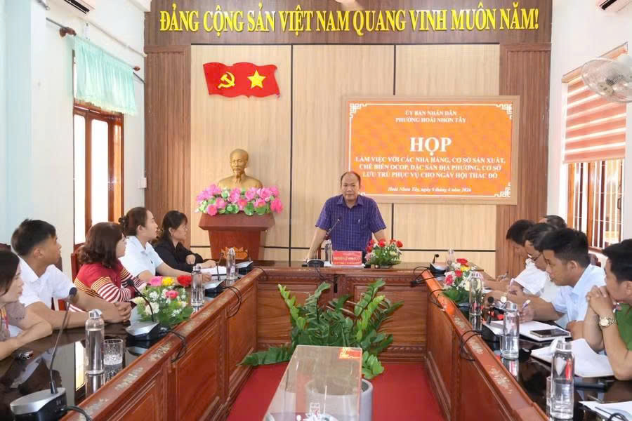 Để chuẩn bị cho ngày hội du lịch “Thác Đổ - Nơi thiên nhiên mời gọi”, ngày 9-4, Chủ tịch UBND phường Hoài Nhơn Tây Nguyễn Lê Anh Tuấn đã chủ trì cuộc họp với các cơ sở sản xuất, kinh doanh, dịch vụ ăn uống, lưu trú và các chủ thể sản phẩm OCOP trên địa bàn.
