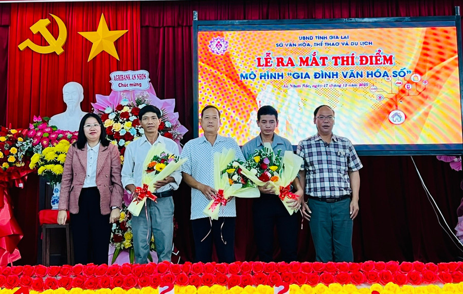Lãnh đạo Sở Văn hóa, Thể thao và Du lịch cùng lãnh đạo phường An Nhơn Bắc tặng hoa chúc mừng Ban Chủ nhiệm mô hình “Gia đình văn hóa số”. Ảnh: P.L