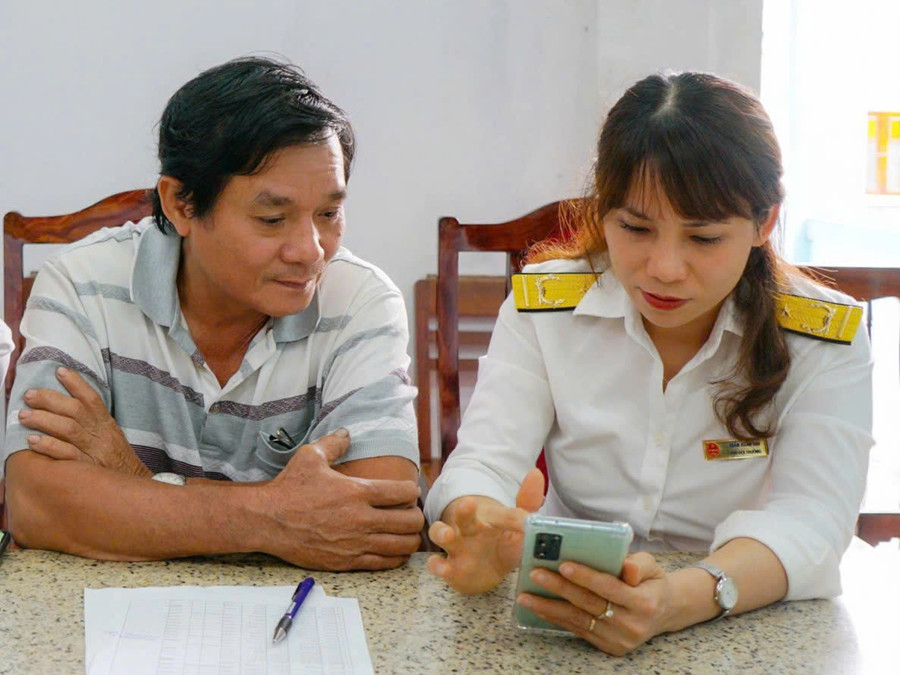 Công chức Thuế cơ sở 1 hướng dẫn hộ kinh doanh nộp thuế điện tử eTax Mobile trên điện thoại di động. Ảnh: T.Sỹ