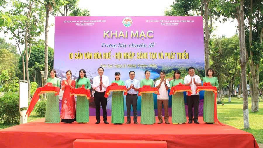 Các đại biểu cắt băng khai mạc trưng bày chuyên đề "Di sản văn hóa Huế - Hội nhập, sáng tạo và phát triển". Ảnh: H.H