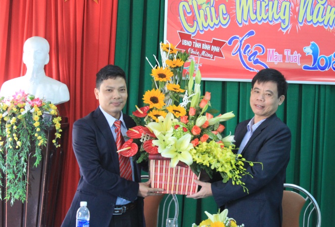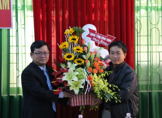 Phó Giám đốc Sở Thông tin và Truyền thông Võ Gia Nghĩa (trái) tặng hoa chúc mừng Đài phát sóng – Phát thanh An Nhơn (thuộc Đài Tiếng nói Việt Nam).