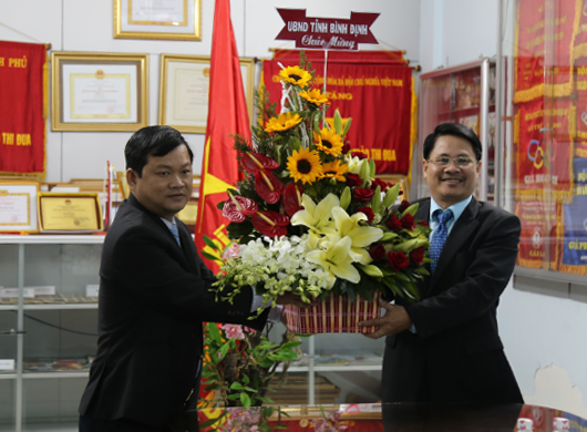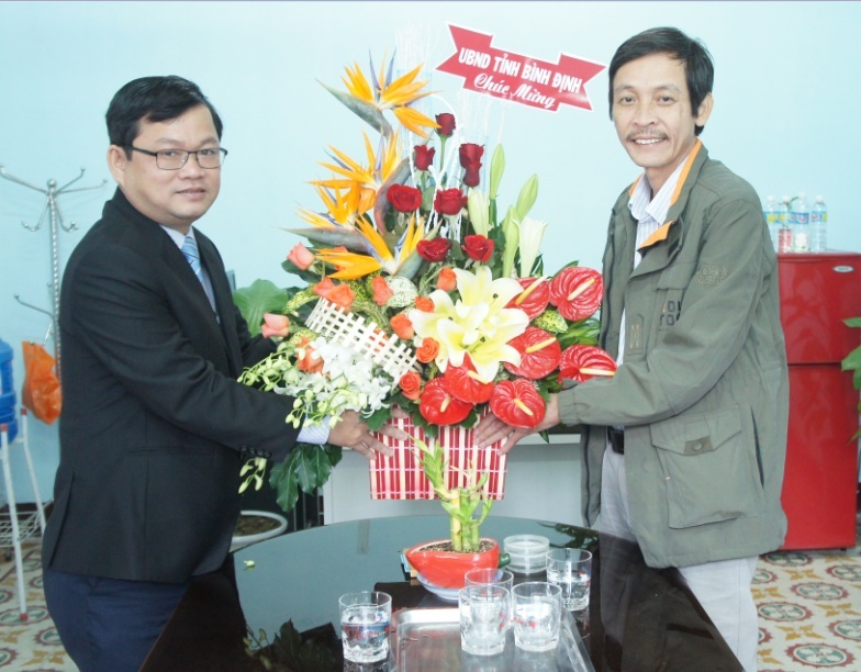 Giám đốc Sở Thông tin và Truyền thông Trần Kim Kha (trái) tặng hoa chúc mừng Báo Bình Định.