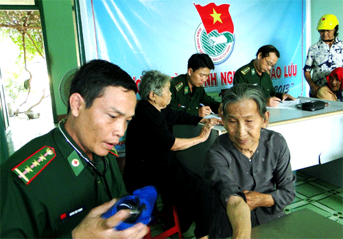 Quân y BĐBP đang khám bệnh, cấp phát thuốc cho nhân dân tại Trạm BP Mỹ Đức.