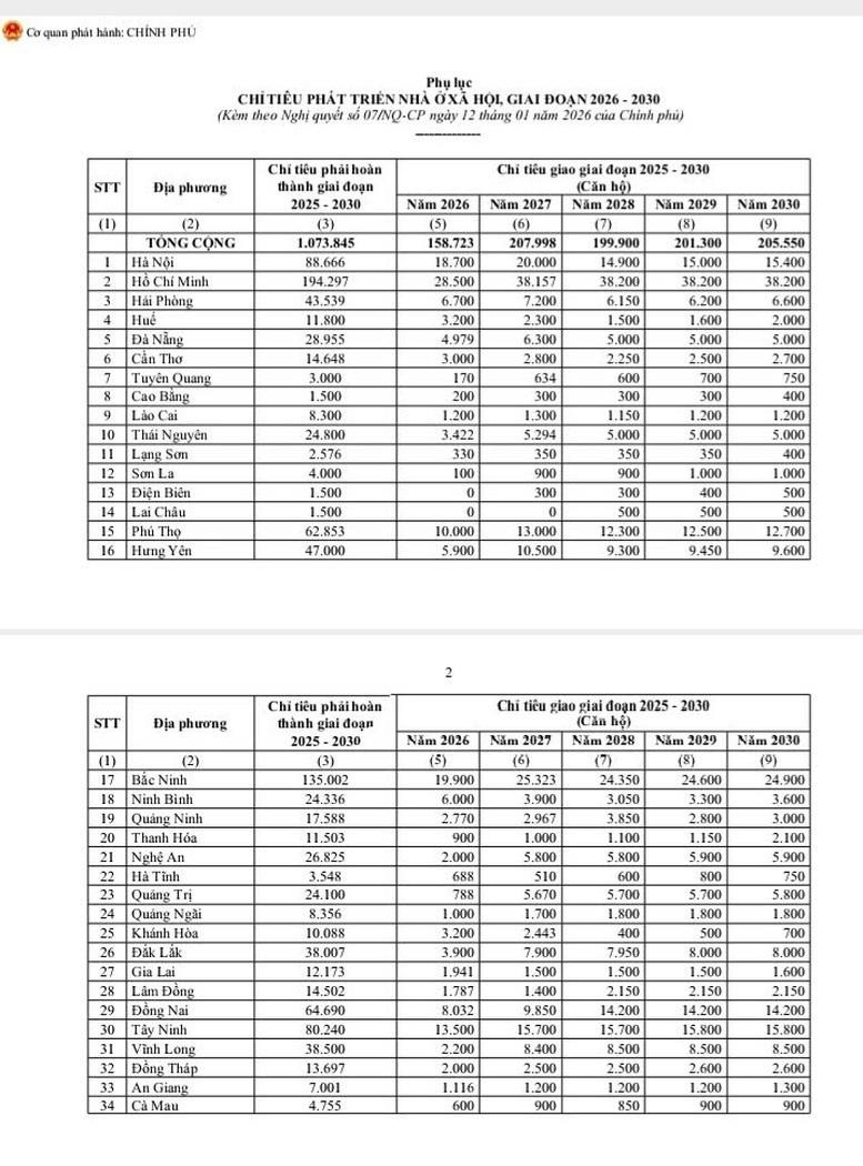 Để đạt được mục tiêu đến năm 2030 hoàn thành hoặc vượt chỉ tiêu đầu tư xây dựng ít nhất 1 triệu căn hộ nhà ở xã hội cho đối tượng thu nhập thấp, công nhân khu công nghiệp, Chính phủ tiếp tục giao chỉ tiêu cho các địa phương trong giai đoạn 2026-2030.