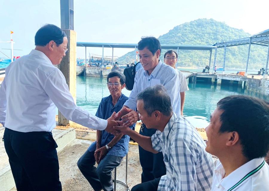 Chủ tịch UBND tỉnh Phạm Anh Tuấn (bìa trái) gặp gỡ, tuyên truyền ngư dân xã Đề Gi chấp hành quy định về chống khai thác IUU. Ảnh: N.N
