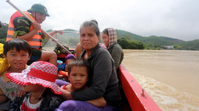 Một gia đình ở thôn Huỳnh Kim, xã Nhơn Hòa, thị xã An Nhơn được đưa ra khỏi vùng ngập lụt - Ảnh: Tiến Thành