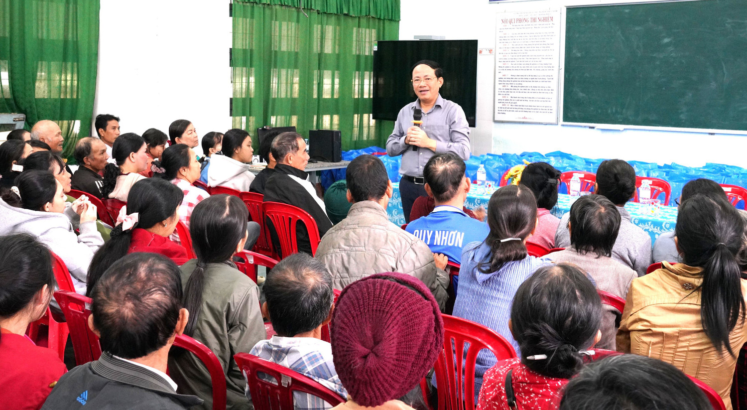 Phó Bí thư Tỉnh ủy, Chủ tịch UBND tỉnh Phạm Anh Tuấn (người đứng) đối thoại với người dân xã Tuy Phước Tây về việc xây dựng các khu tái định cư vùng sạt lở, ngập lụt nguy hiểm trên địa bàn. Ảnh: N.H