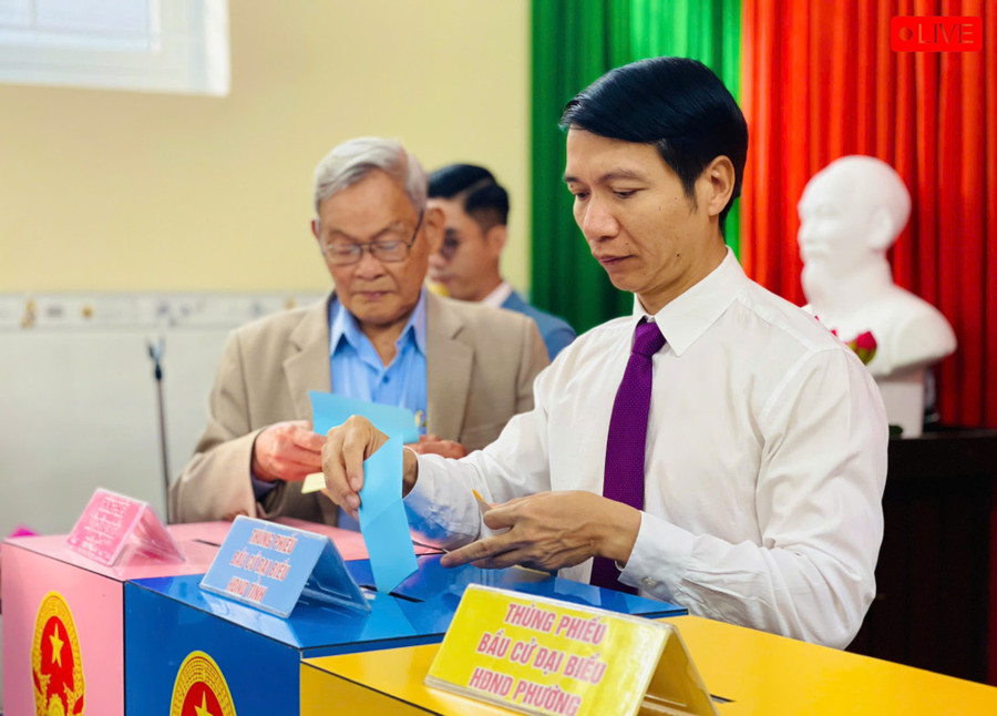 Đồng chí Châu Ngọc Tuấn bỏ lá phiếu đầu tiên tại điểm bỏ phiếu khu vực số 7, phường Diên Hồng. Ảnh: Hoàng Hoài