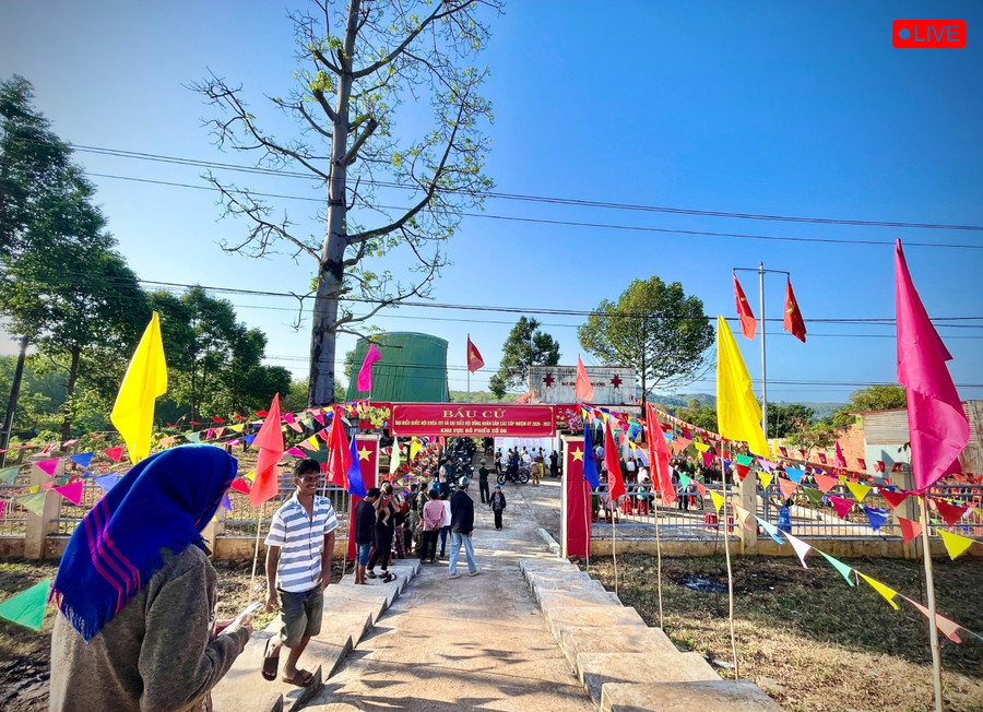 Không khí rộn ràng, cờ hoa rực rỡ trong ngày bầu cử tại xã biên giới Ia Dom. Ảnh: Minh Phương