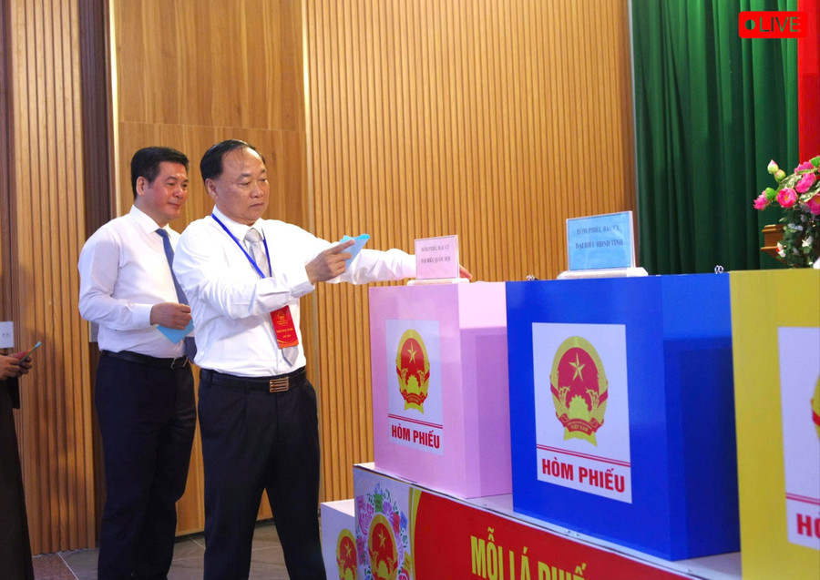 Các đồng chí lãnh đạo Trung ương và tỉnh cũng trực tiếp thực hiện quyền công dân, bỏ những lá phiếu đầu tiên tại khu vực bỏ phiếu số 20.