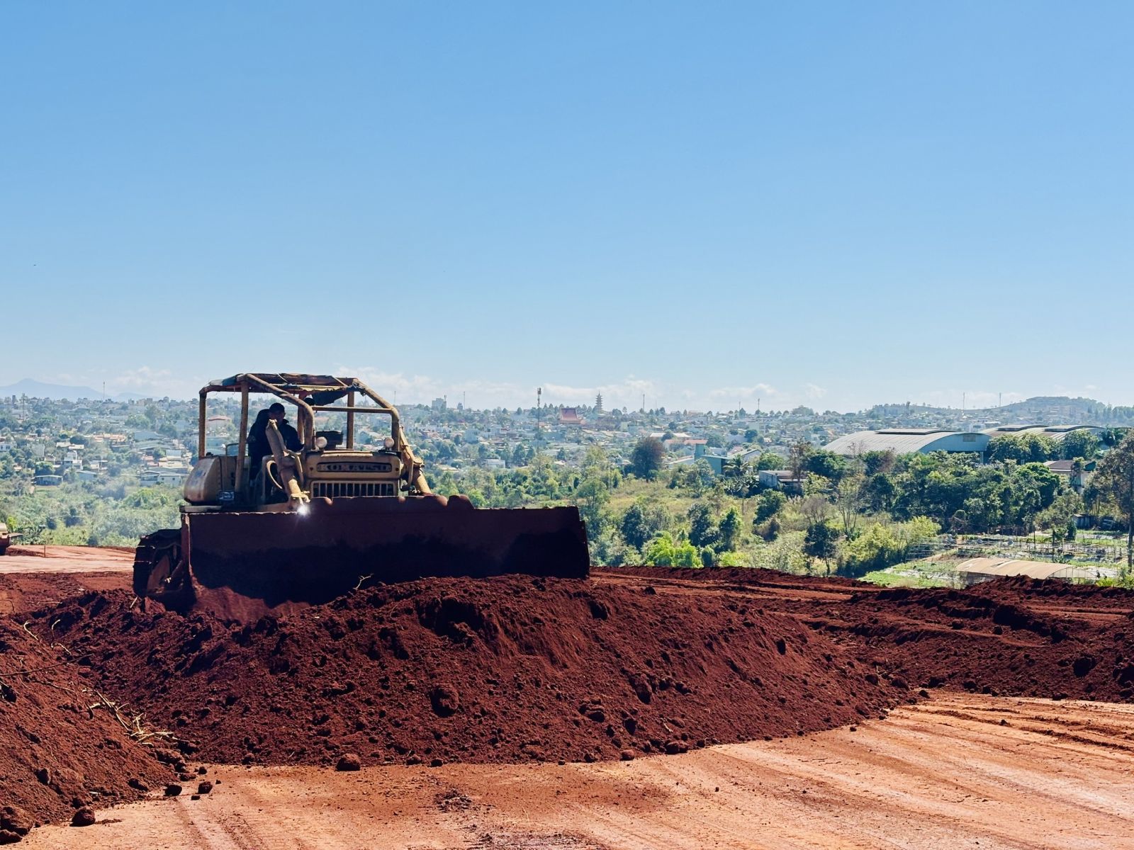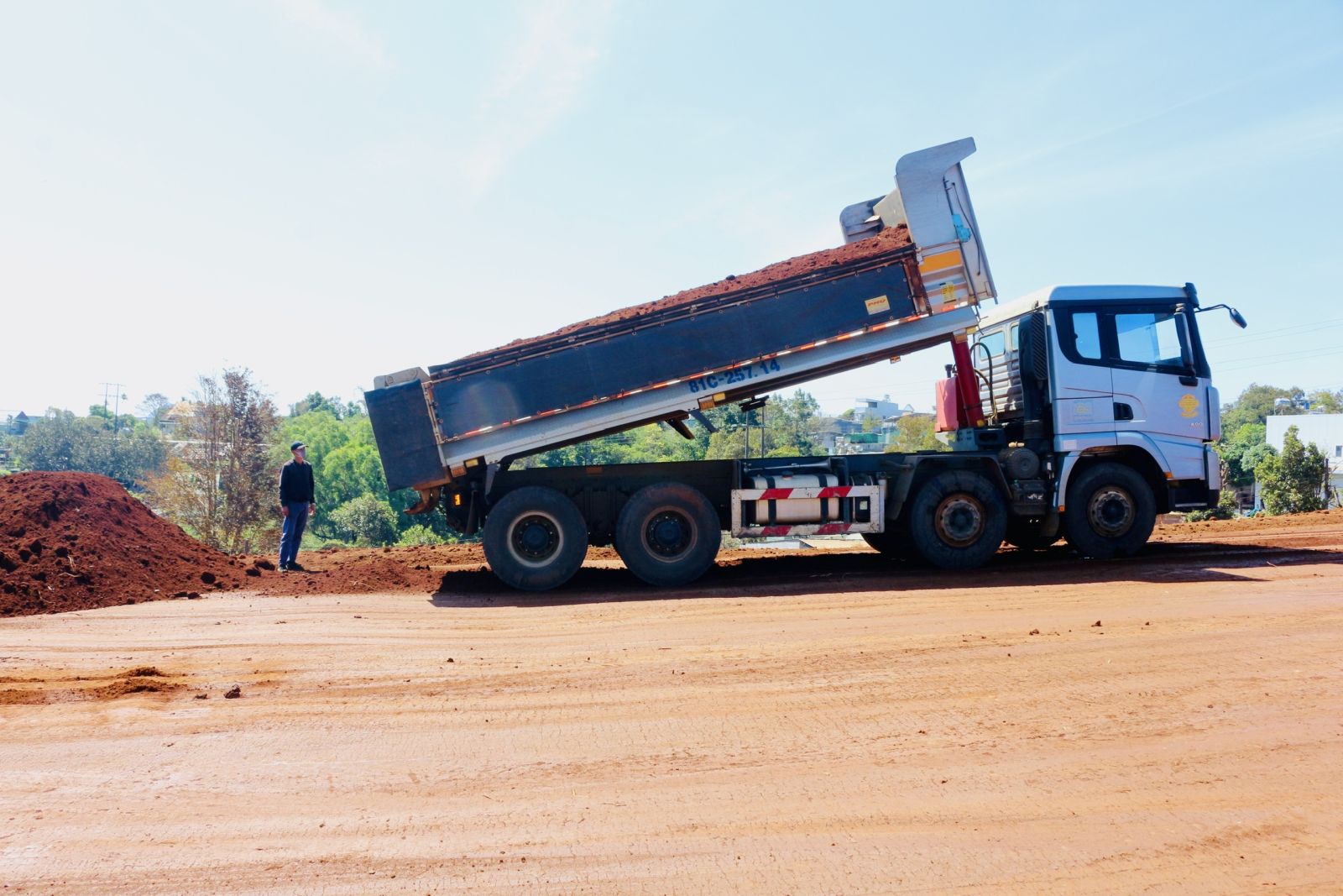 Đội ngũ công nhân, phương tiện thi công đang gấp rút hoàn thiện các hạng mục dự án