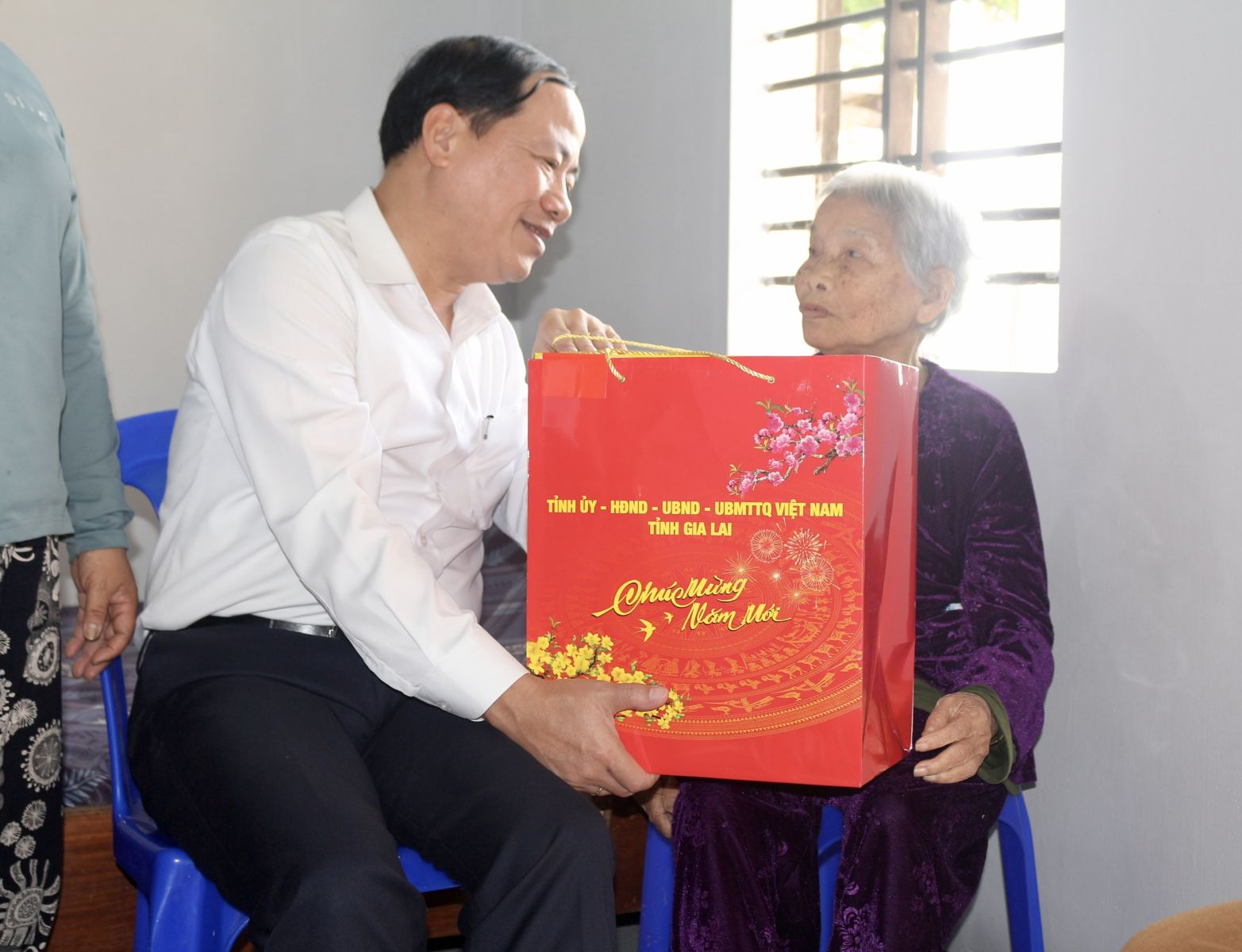 Chủ tịch UBND tỉnh ân cần hỏi thăm sức khỏe, cuộc sống bà Nguyễn Thị Thơm (thân nhân liệt sĩ, thôn Cảnh An 2, xã Tuy Phước Tây)
