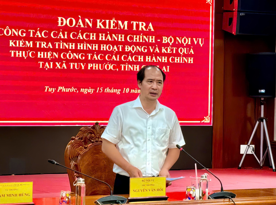 Thứ trưởng Bộ Nội vụ Nguyễn Văn Hồi phát biểu tại buổi làm việc với xã Tuy Phước. Ảnh: T.K