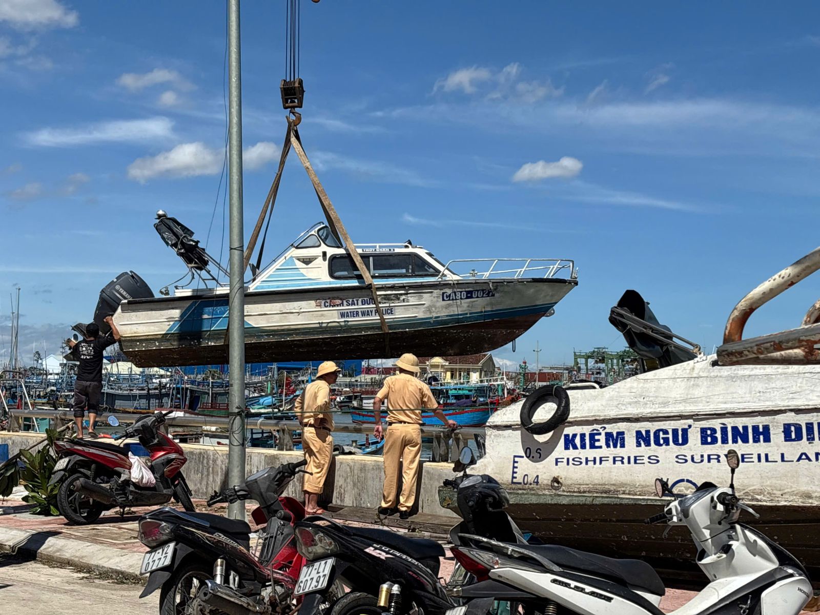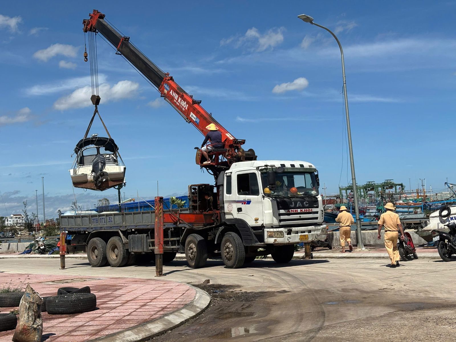 Lực lượng chức năng tiến hành trục vớt các tàu, thuyền, cano bị hư hỏng do bão số 13 gây ra