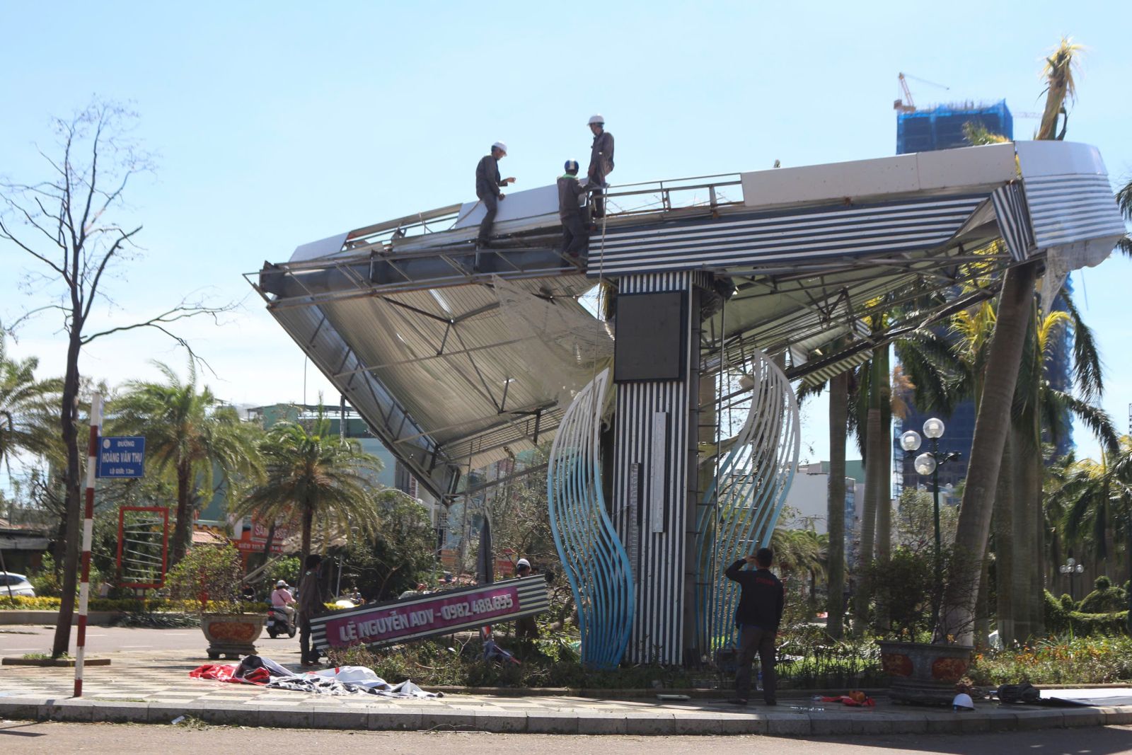 Lực lượng chức năng đang thu dọn, khắc phục bảng hiệu quảng cáo lớn gãy đổ trên đường Nguyễn Tất Thành
