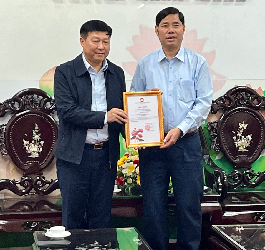 Phó Chủ tịch Thường trực Ủy ban MTTQ Việt Nam tỉnh Gia Lai Trần Minh Sơn (phải) trao thư cảm ơn Ủy ban MTTQ Việt Nam TP Hà Nội. Ảnh: Bảo Long