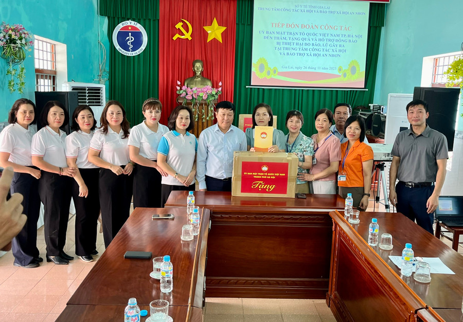 Cũng trong ngày 26-11, đoàn công tác Ủy ban MTTQ Việt Nam TP Hà Nội đã đến thăm hỏi, động viên và trao 10 triệu đồng tiền mặt, 300 bộ quần áo mới cùng nhiều nhu yếu phẩm hỗ trợ Trung tâm Công tác xã hội và Bảo trợ xã hội An Nhơn khắc phục thiệt hại sau bão.
