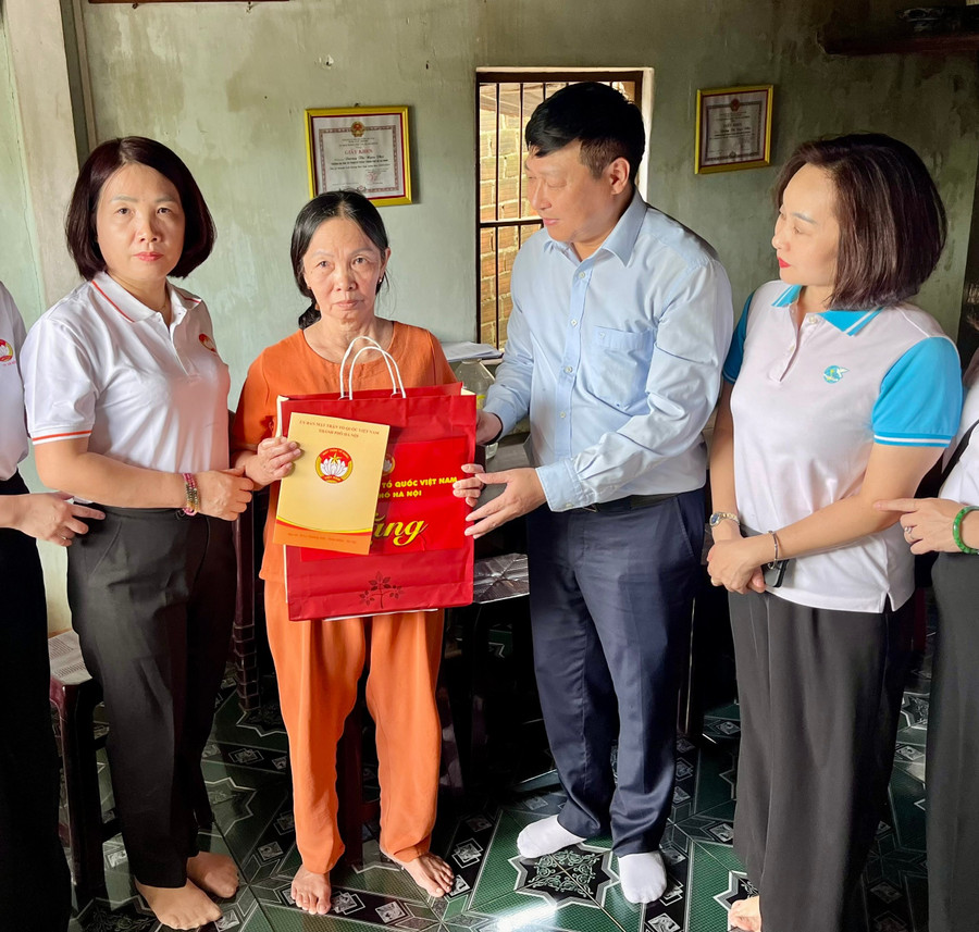 Đoàn công tác của Ủy ban MTTQ Việt Nam TP Hà Nội tặng quà cho gia đình bà Huỳnh Thị Hiếu, ở khu phố Kim Châu , phường Bình Định. Ảnh: Bảo Long