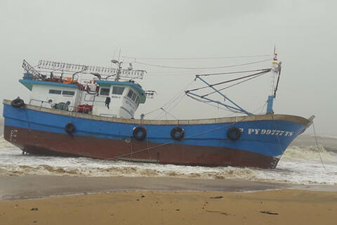 Rạng sáng 4.11, người dân P.Trần Phú, TP.Quy Nhơn (Bình Định) phát hiện tàu cá vỏ thép PY 99777TS của tỉnh Phú Yên bị sóng và gió tấp lên bãi biển.