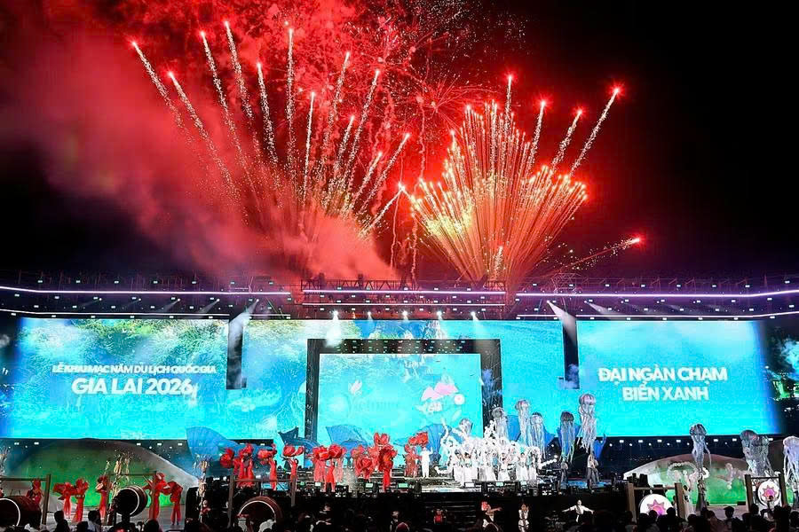 Lễ khai mạc Năm Du lịch quốc gia - Gia Lai 2026 và Mega Concert “Gia Lai - Đại ngàn chạm biển xanh” đã tạo dấu ấn khác biệt khi được dàn dựng công phu, kết hợp giữa nghệ thuật thực cảnh, công nghệ sân khấu hiện đại và sức hút khuấy động từ đại nhạc hội “Vũ trụ say hi”.